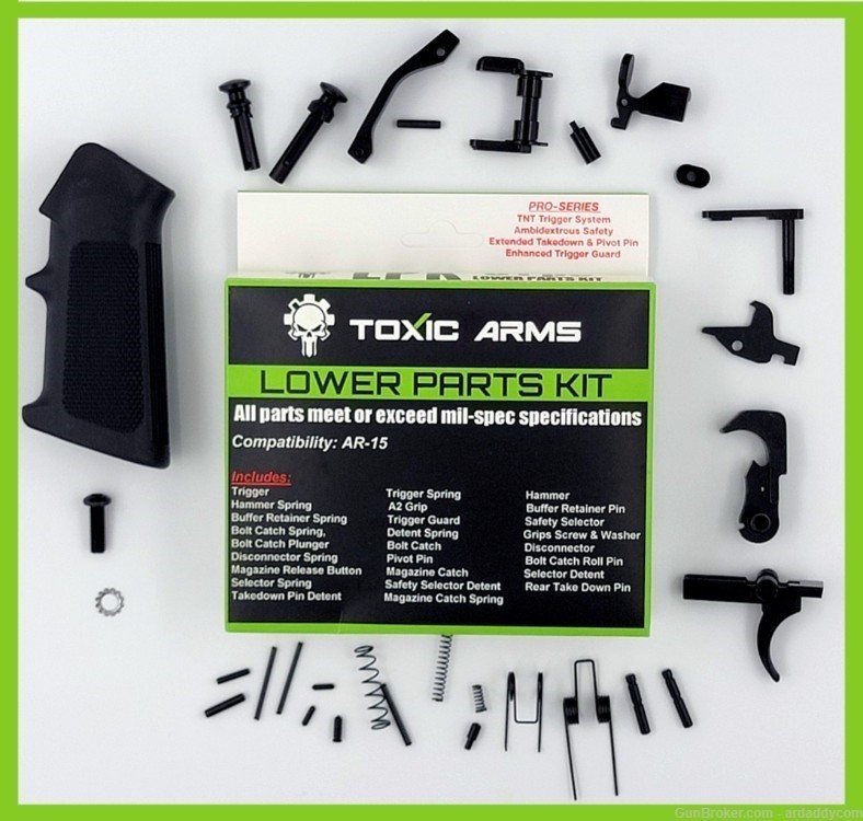 The Toxic Arms AR-15 Enhanced Lower Parts Kit comes with 31 pieces needed to complete a lower. Quality steel parts are precision machined for an excellent fit.